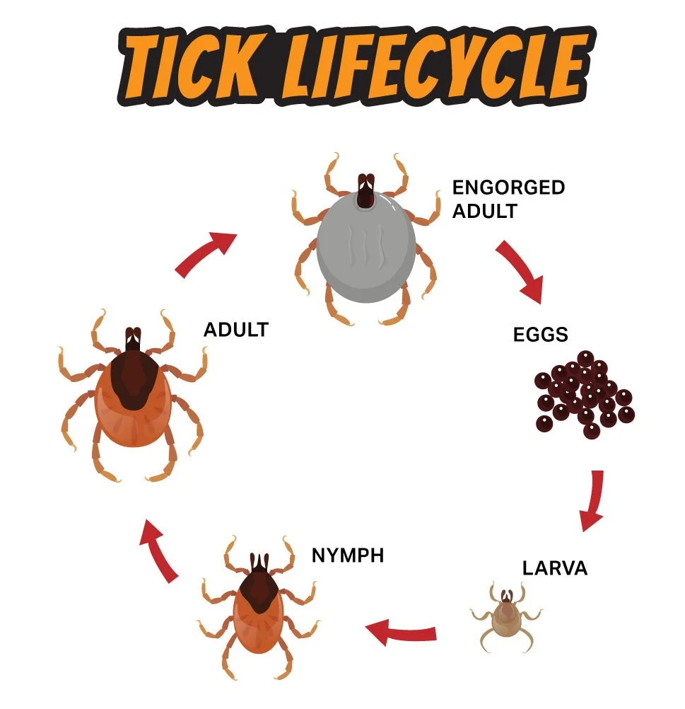 LARVA: A tiny, six-legged baby tick hatches, usually in the summer. It finds a small host, like a mouse, for its first meal.